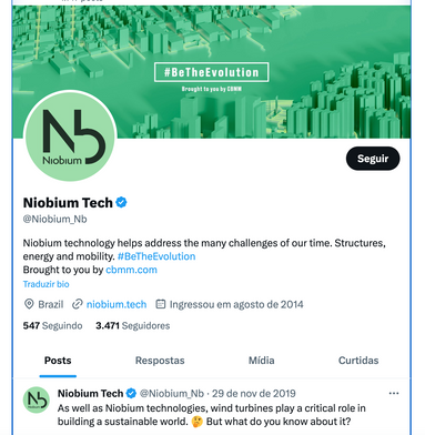 CBMM is a company based in Brazil that mines minerals to produce niobium. Created by CBMM, Niobium Tech is an international company that distributes materials used in the construction, energy, and mobility sectors.
